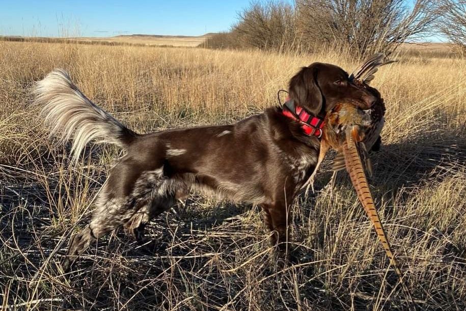 One of Scott’s most memorable hunting experiences with Lovec is when he was hunting him on the Iowa opener. At this time Lovec was only 7 months old and had minimal hunting exposure the summer before hunting season. Scott was out with Lovec and shot at a rooster but it went down and took off running. Scott watched Lovec via GPS track the pheasant 185 yards before catching it. What a day to remember! And that’s not the only long retrieve Lovec has made… When Lovec reached 2.5 years of age, Scott had another rooster try taking off on him, but this time Lovec didn’t see the bird hit the ground after the shot. Scott gave the “Dead Bird” command and once again, Lovec, tracked and retrieved the bird. Scott had it recorded on his GPS as a 365 yard track by Lovec and another retrieved bird to hand.