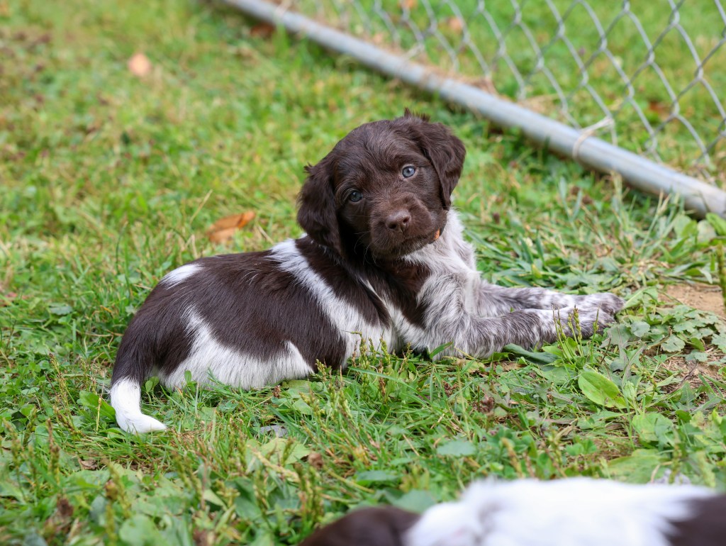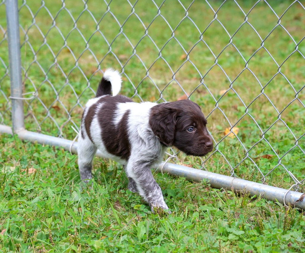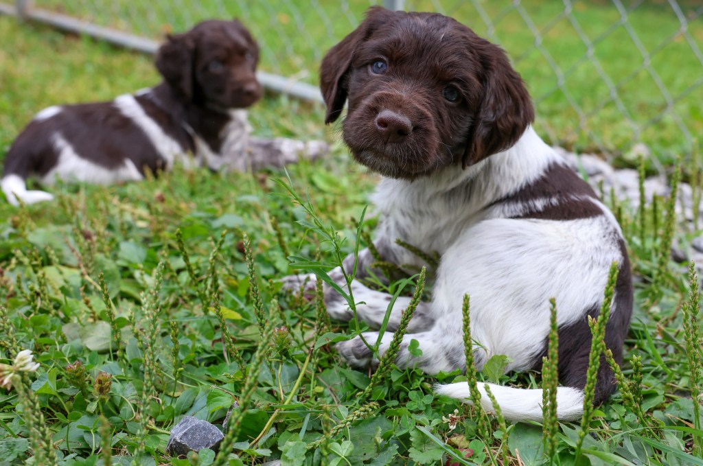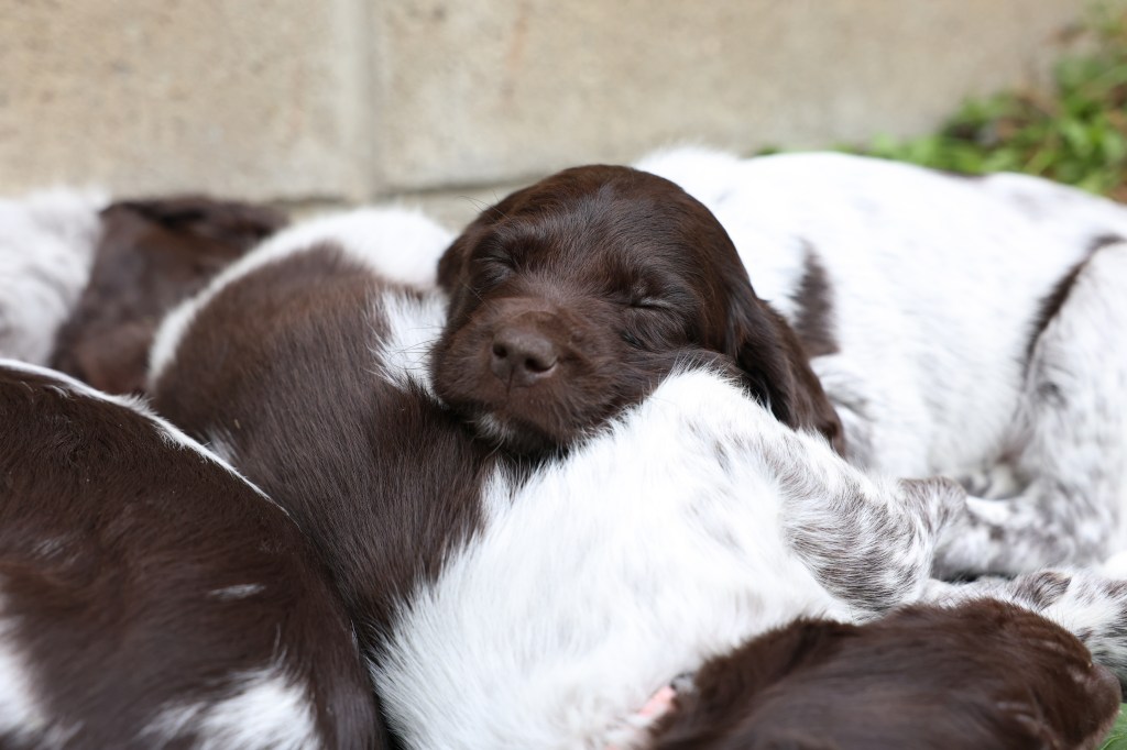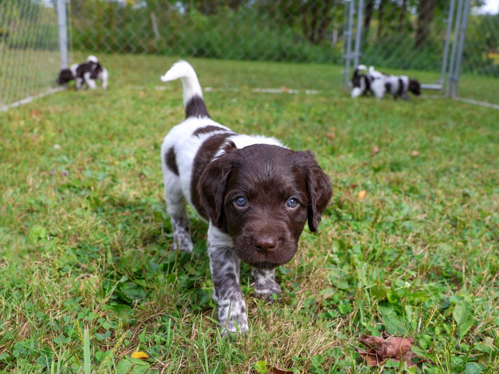 D Litter: IntCH Brush Dale’s Ultimate Beauty (Canyon) was bred to IntCH Brush Dale’s Make My Day (Beaker) on June 5th 2025. 9 beautiful puppies were born on August 1st from 9:30 am till 1:40 pm. Canyon had 6 females and 3 males that are all roan in color. The puppies went to their new homes at the end of September/ beginning of October. This was a very nice litter of puppies. The temperament of these puppies was consistent across the board! All of the puppies are very social and love to give kisses. When they are given a new place or objects to explore they are all eager to investigate. Canyon produces very confident and bold puppies who are also easy to handle when picked up. The new owners are amazed at how quick their puppies are learning basic commands and some have even had short successful tracks on deer and flash points on yard birds. Puppies are expected to average size for a Small Munsterlander (females 52 – 54 cm and males 54 – 56 cm).