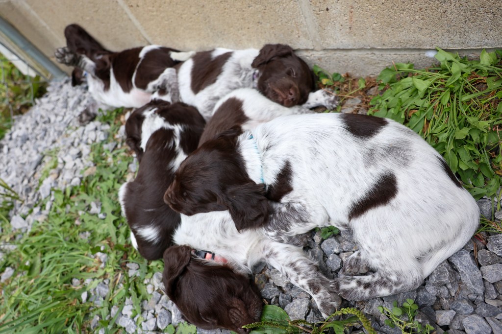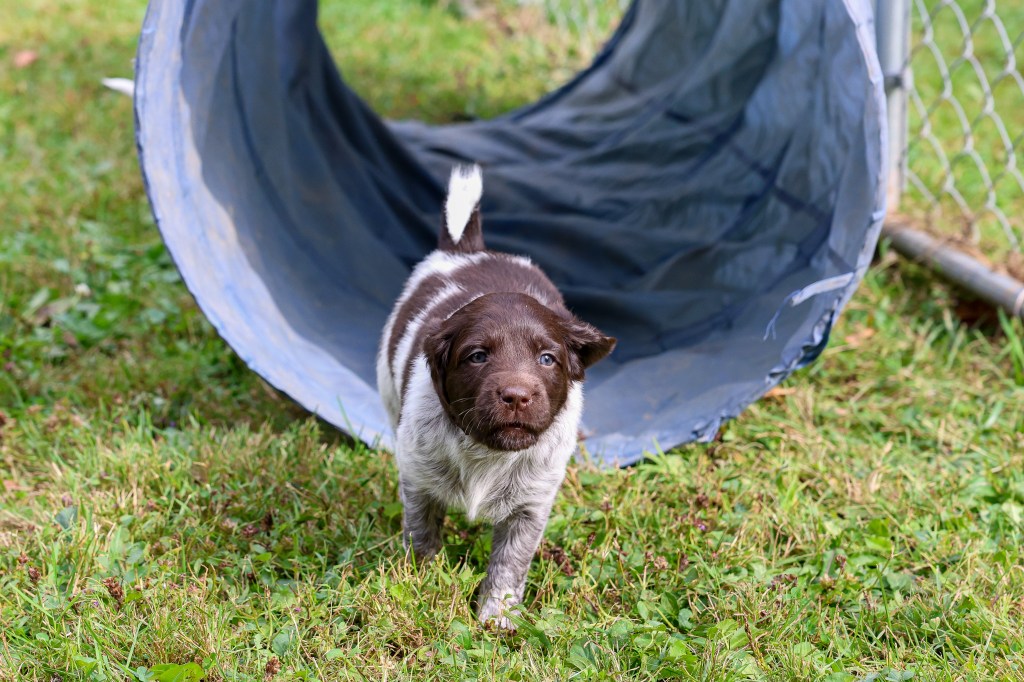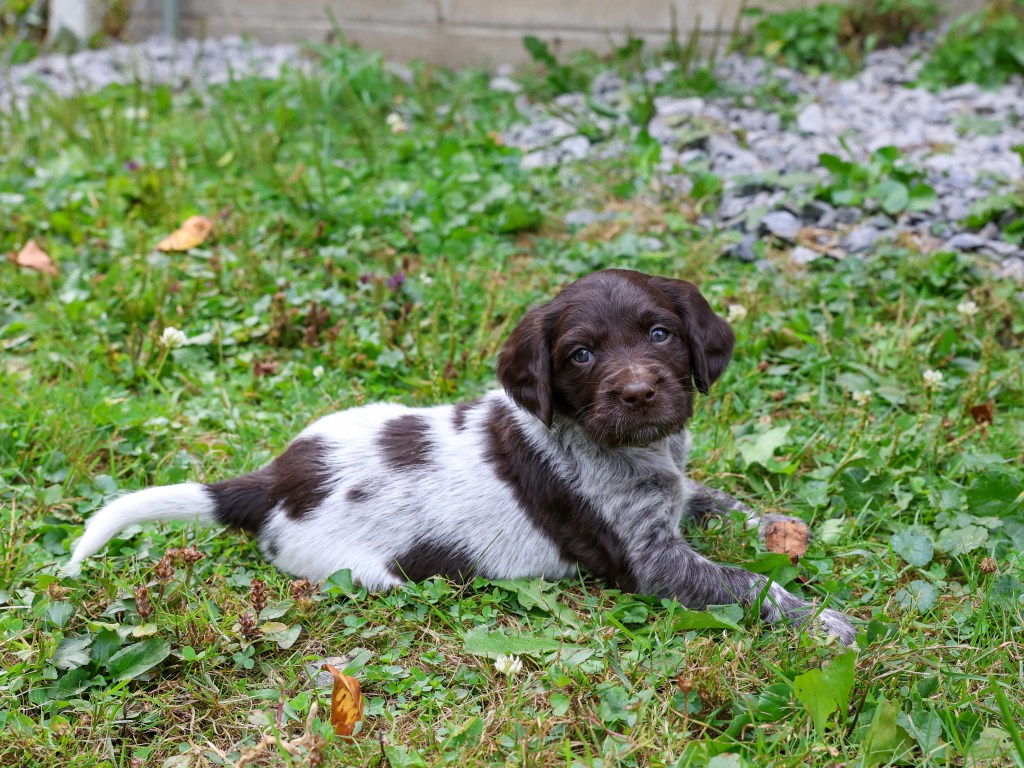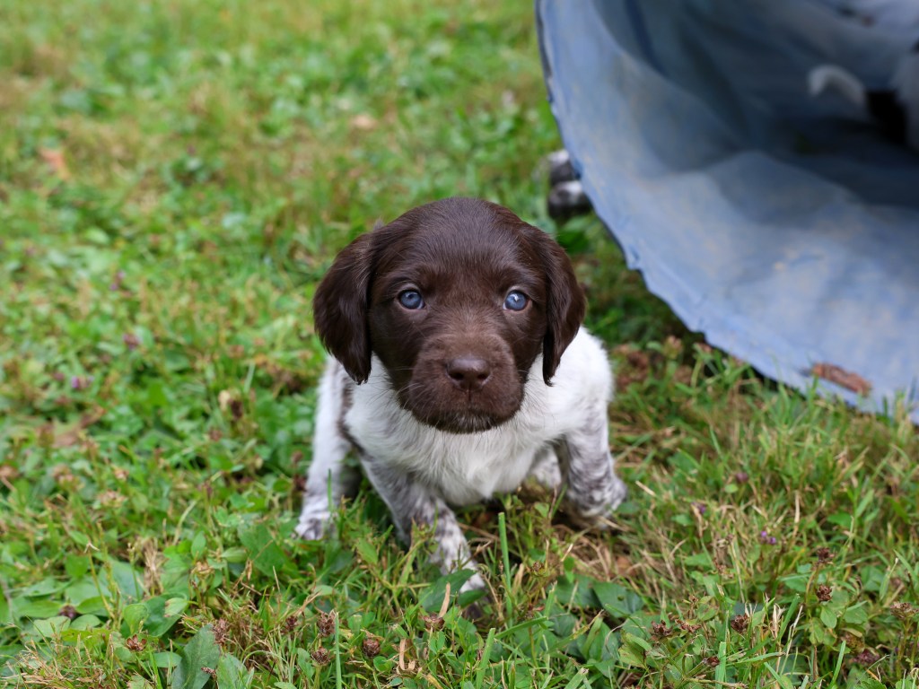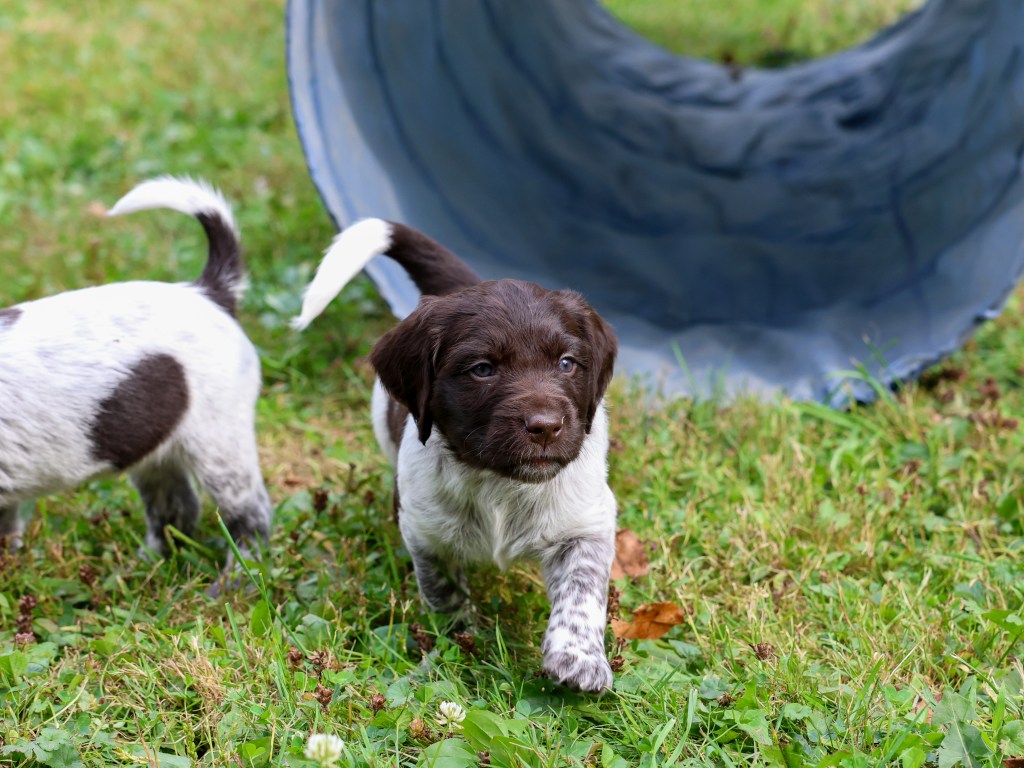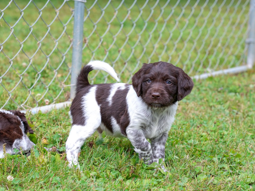 D Litter: IntCH Brush Dale’s Ultimate Beauty (Canyon) was bred to IntCH Brush Dale’s Make My Day (Beaker) on June 5th 2025. 9 beautiful puppies were born on August 1st from 9:30 am till 1:40 pm. Canyon had 6 females and 3 males that are all roan in color. The puppies went to their new homes at the end of September/ beginning of October. This was a very nice litter of puppies. The temperament of these puppies was consistent across the board! All of the puppies are very social and love to give kisses. When they are given a new place or objects to explore they are all eager to investigate. Canyon produces very confident and bold puppies who are also easy to handle when picked up. The new owners are amazed at how quick their puppies are learning basic commands and some have even had short successful tracks on deer and flash points on yard birds. Puppies are expected to average size for a Small Munsterlander (females 52 – 54 cm and males 54 – 56 cm).