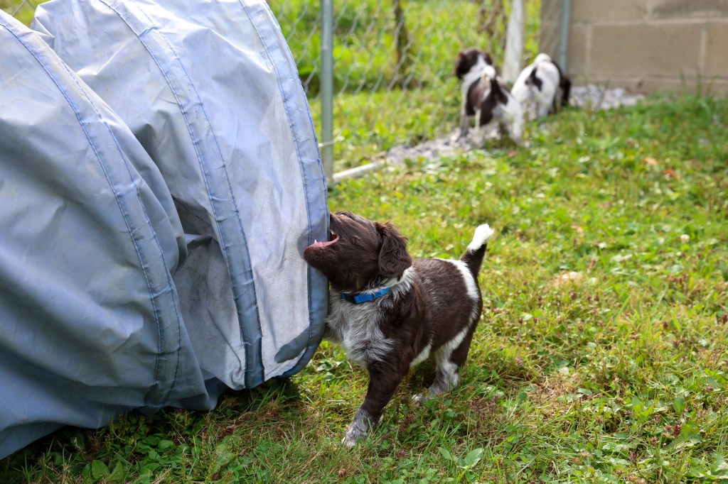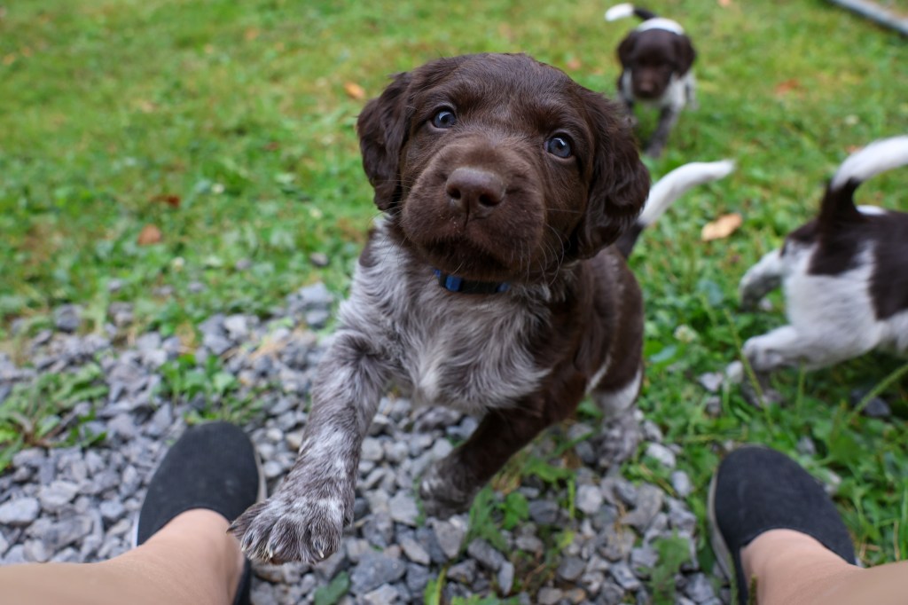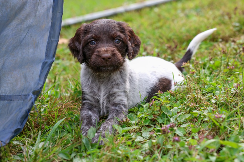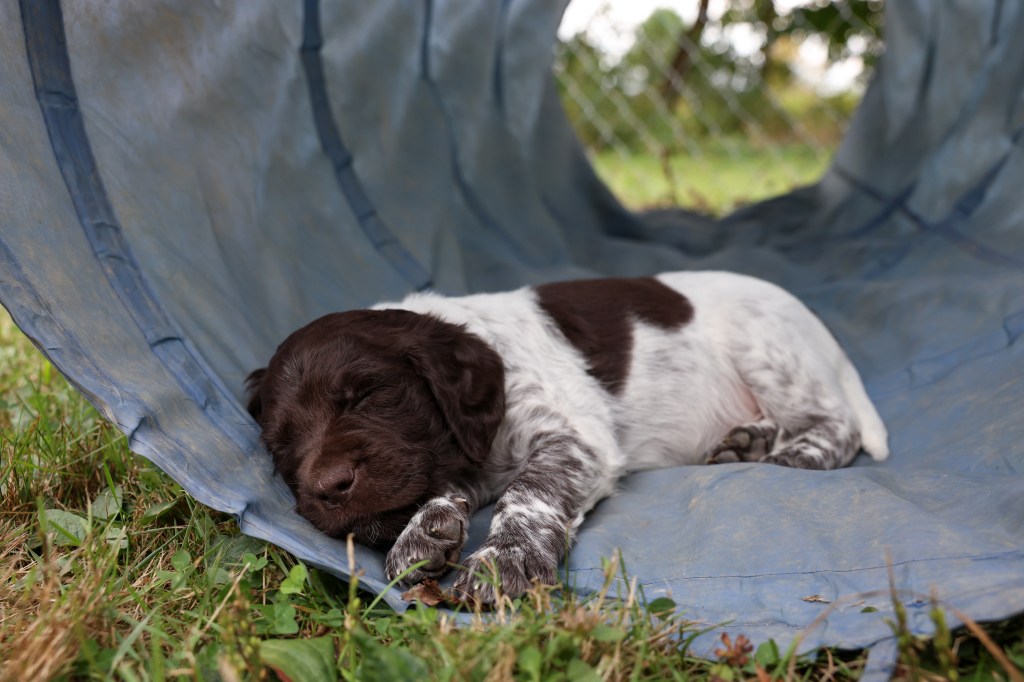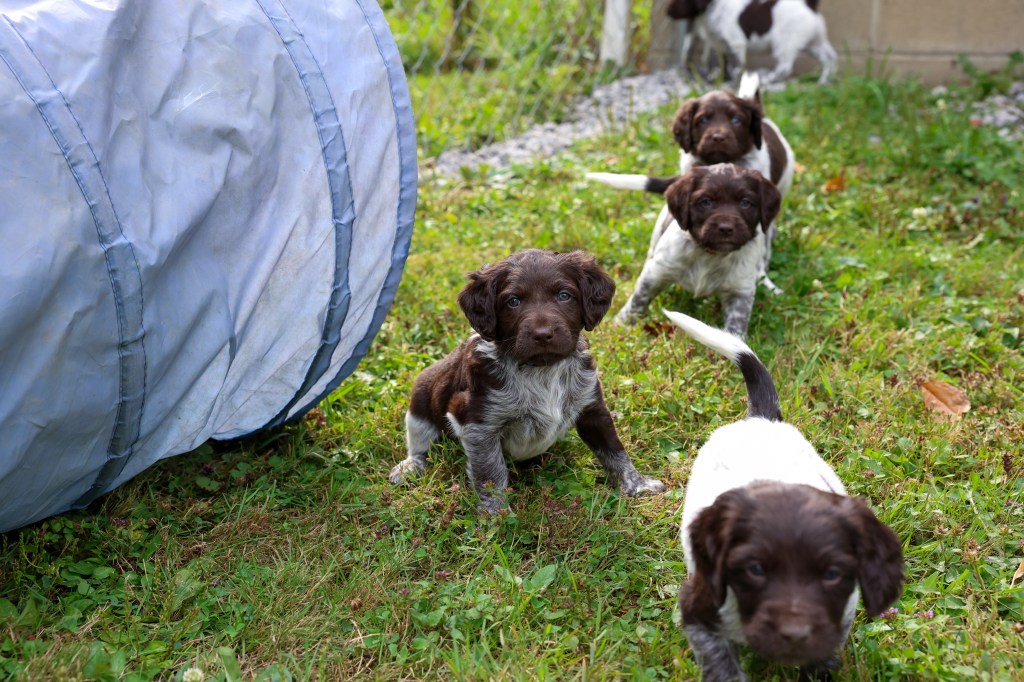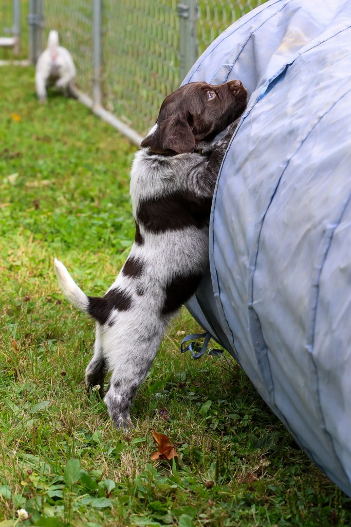 D Litter: IntCH Brush Dale’s Ultimate Beauty (Canyon) was bred to IntCH Brush Dale’s Make My Day (Beaker) on June 5th 2025. 9 beautiful puppies were born on August 1st from 9:30 am till 1:40 pm. Canyon had 6 females and 3 males that are all roan in color. The puppies went to their new homes at the end of September/ beginning of October. This was a very nice litter of puppies. The temperament of these puppies was consistent across the board! All of the puppies are very social and love to give kisses. When they are given a new place or objects to explore they are all eager to investigate. Canyon produces very confident and bold puppies who are also easy to handle when picked up. The new owners are amazed at how quick their puppies are learning basic commands and some have even had short successful tracks on deer and flash points on yard birds. Puppies are expected to average size for a Small Munsterlander (females 52 – 54 cm and males 54 – 56 cm).