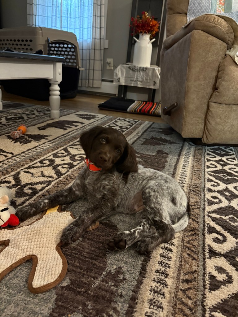 D Litter: IntCH Brush Dale’s Ultimate Beauty (Canyon) was bred to IntCH Brush Dale’s Make My Day (Beaker) on June 5th 2025. 9 beautiful puppies were born on August 1st from 9:30 am till 1:40 pm. Canyon had 6 females and 3 males that are all roan in color. The puppies went to their new homes at the end of September/ beginning of October. This was a very nice litter of puppies. The temperament of these puppies was consistent across the board! All of the puppies are very social and love to give kisses. When they are given a new place or objects to explore they are all eager to investigate. Canyon produces very confident and bold puppies who are also easy to handle when picked up. The new owners are amazed at how quick their puppies are learning basic commands and some have even had short successful tracks on deer and have been very staunch on point for a young age. Puppies are expected to average size for a Small Munsterlander (females 52 – 54 cm and males 54 – 56 cm).