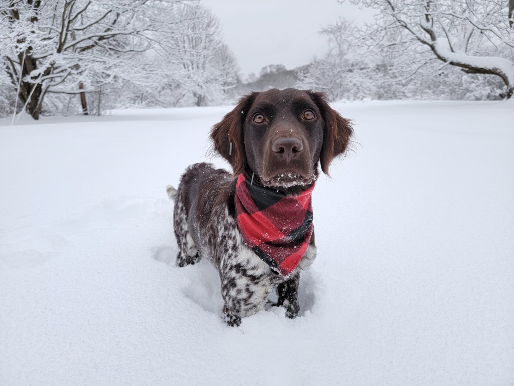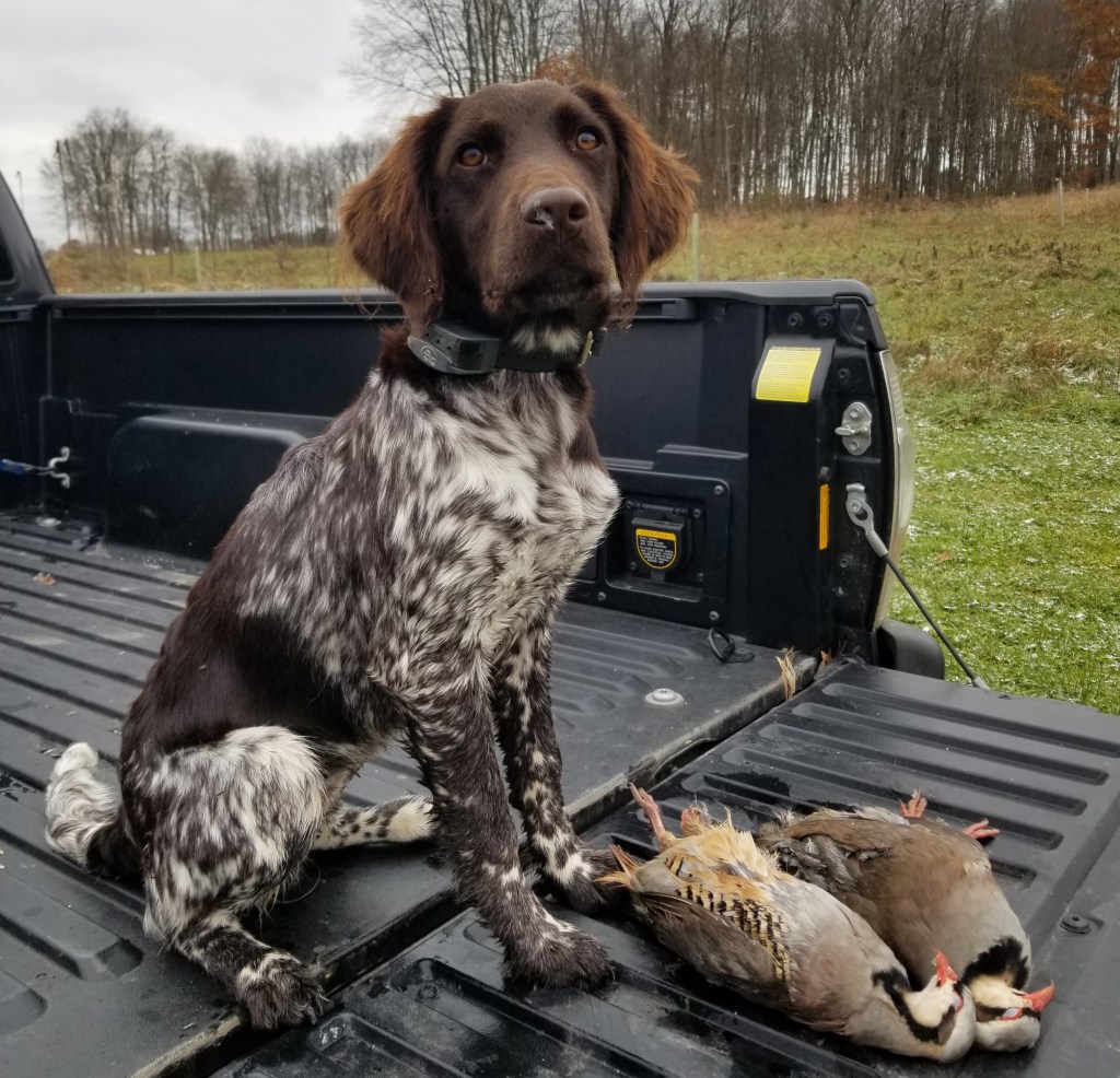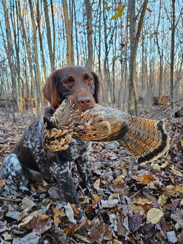 Denver is a very bold hunting dog by running through brush, jumping right into water and she will gladly be the first to investigate any new experience. She has shown great potential as a hunting dog with her strong desire in field and water. She also has caught many wild rabbits in our large yard and retrieved them back to me. Very athletic! She has jumped straight up off the ground 4 feet onto a tree branch to try and find chipmunks. I think the name Out of This World has fit her well. Over the last 3 years, Denver has been our go to dog for any hunting. She is very cooperative and aims to please when out in the woods or fields. I am looking forward to keeping a puppy from this dog to continue her progeny.