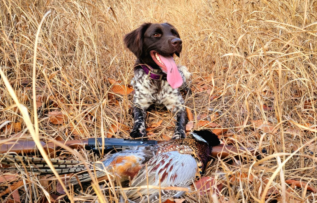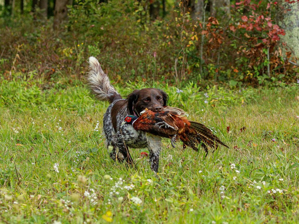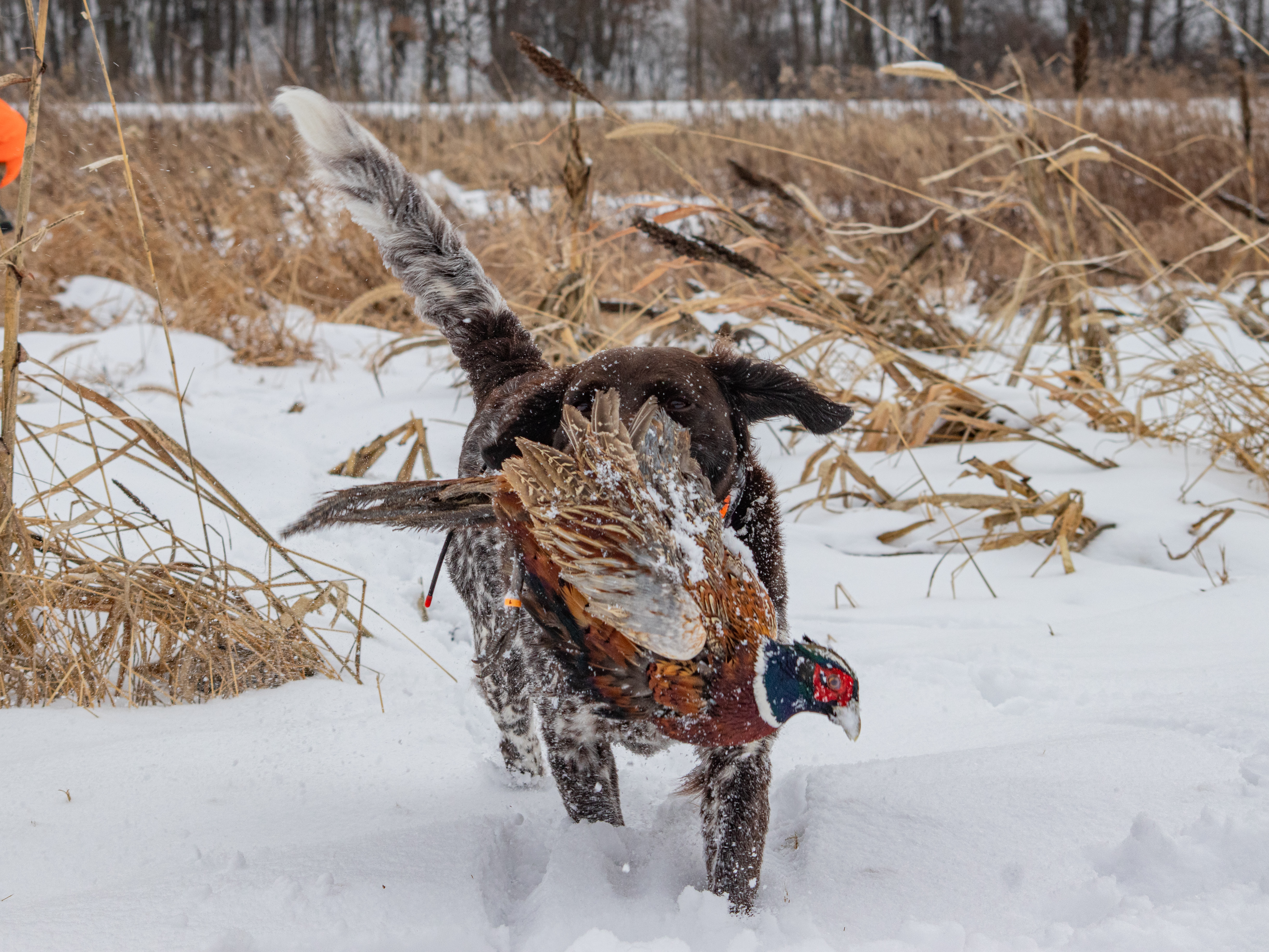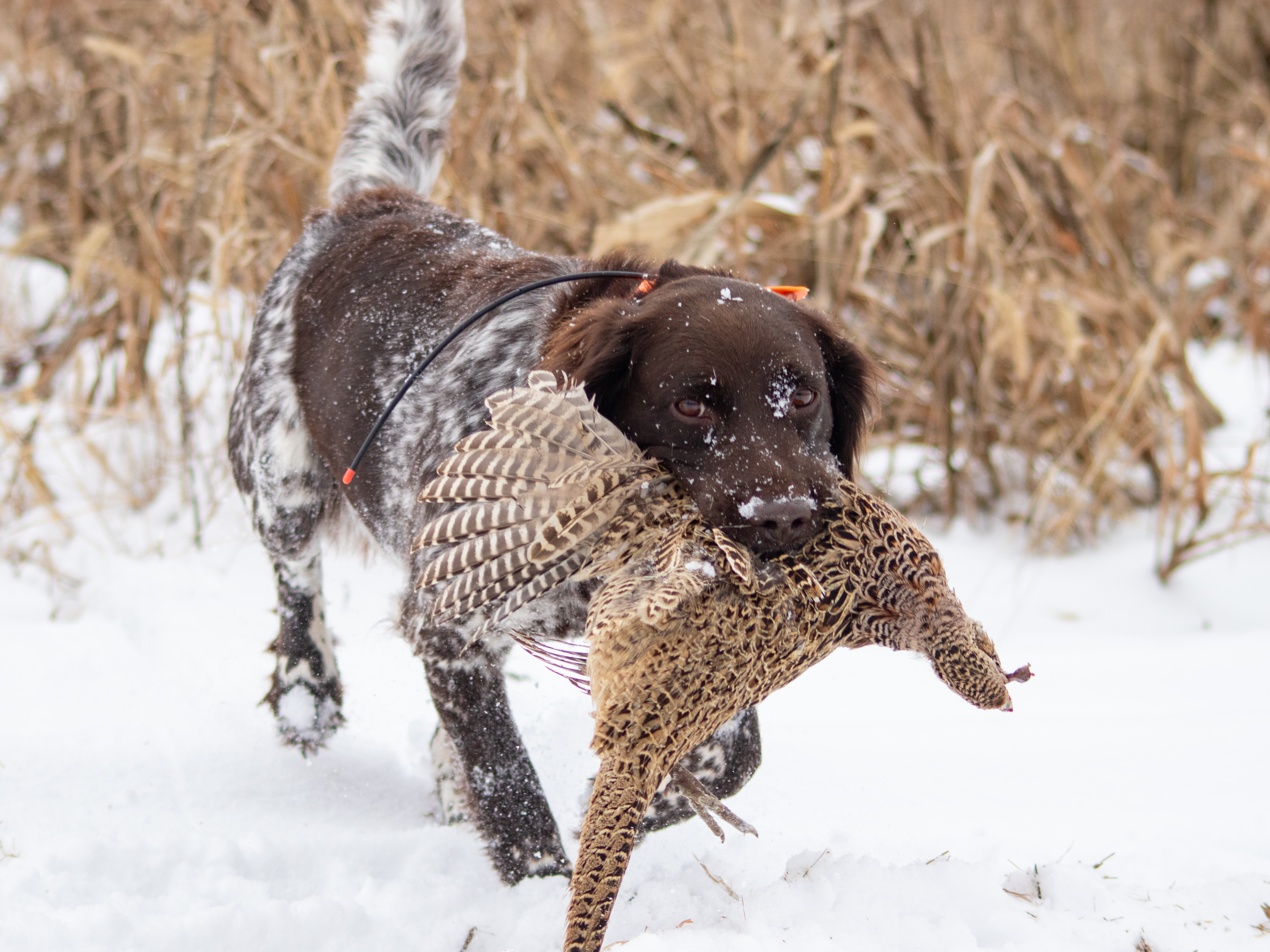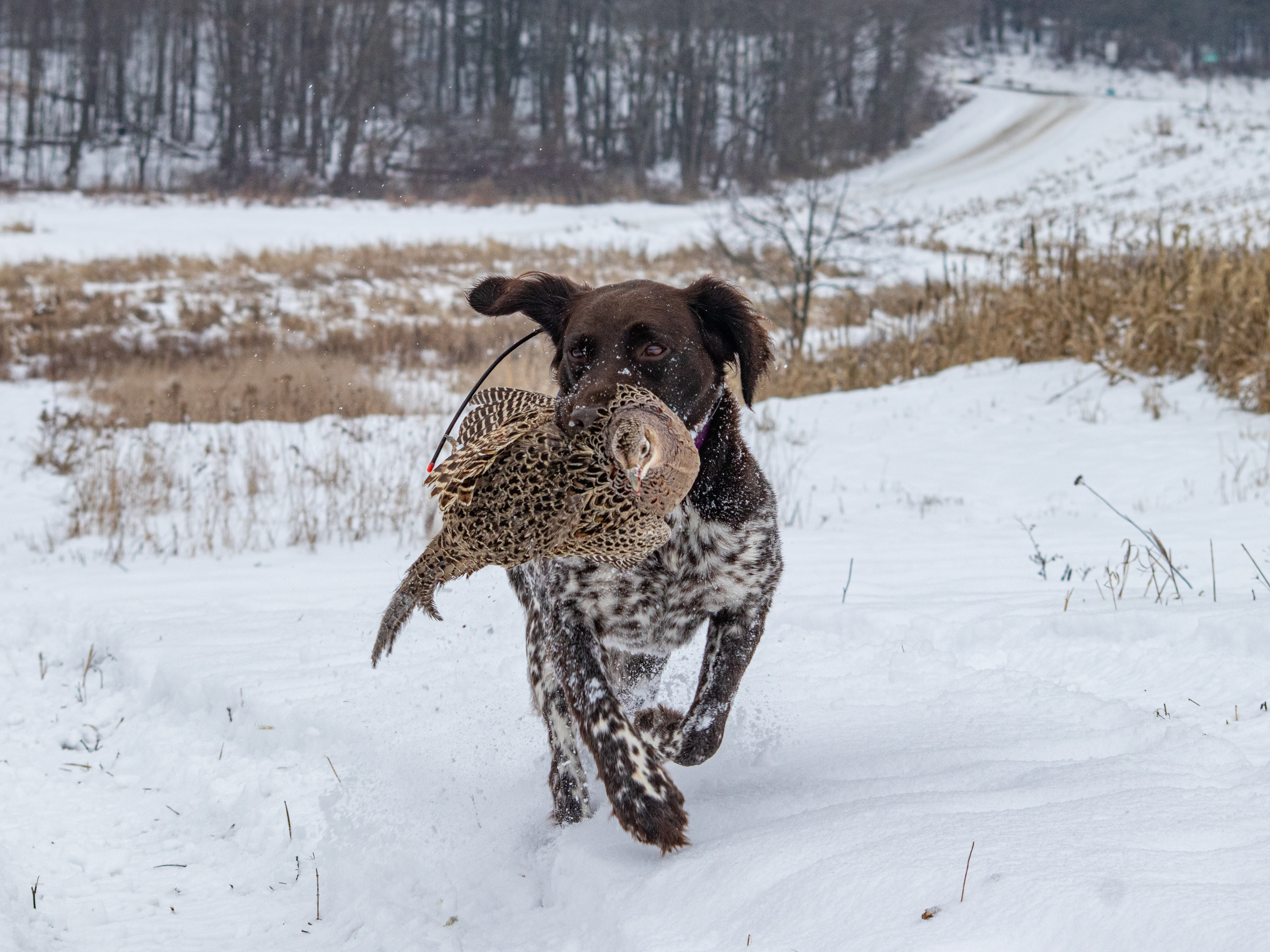 Denver and I were hunting in the PA gamelands. Denver went on point and then looked at me and waited for me to move in. I went over and didn't see anything, so I told her, "Easy." Denver took every single step after that with extreme caution as she followed the track. She would move forward a few steps and then stop and look back at me as we worked together towards the bird. At about 100-150 yards later, Denver went on point. Lots of intensity. I moved in on the bird and out flys a rooster. After my shot, Denver took off after the bird. She finds and races back to me to deliver the bird. A well-deserved pheasant, indeed.