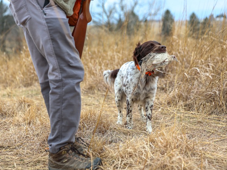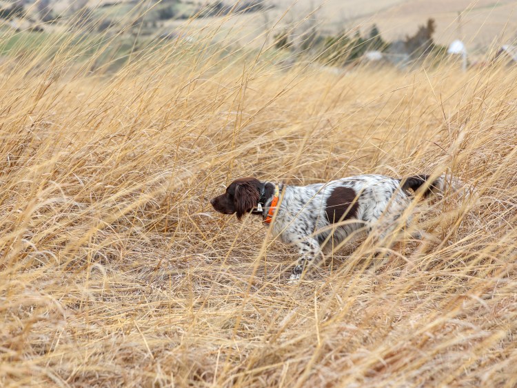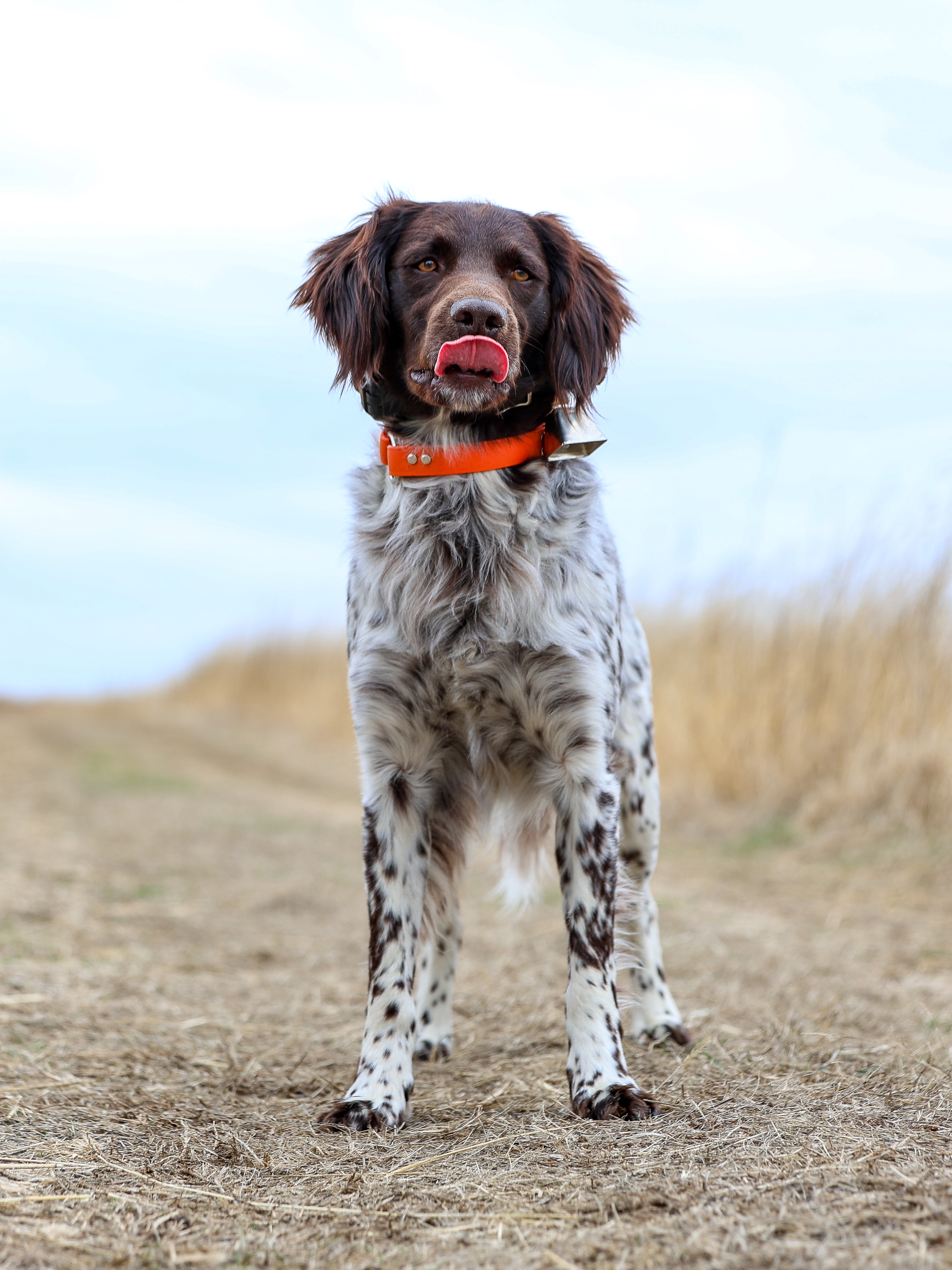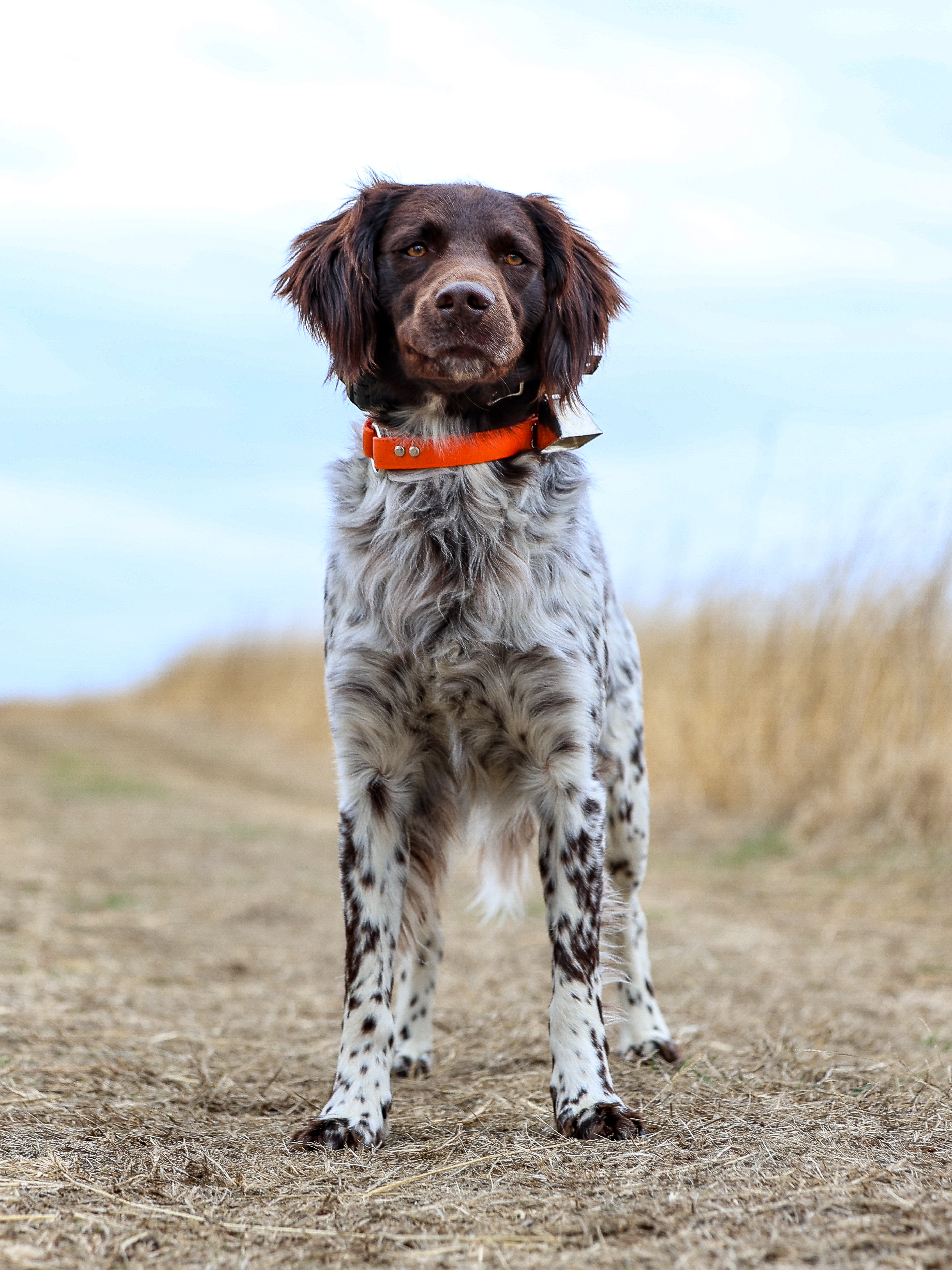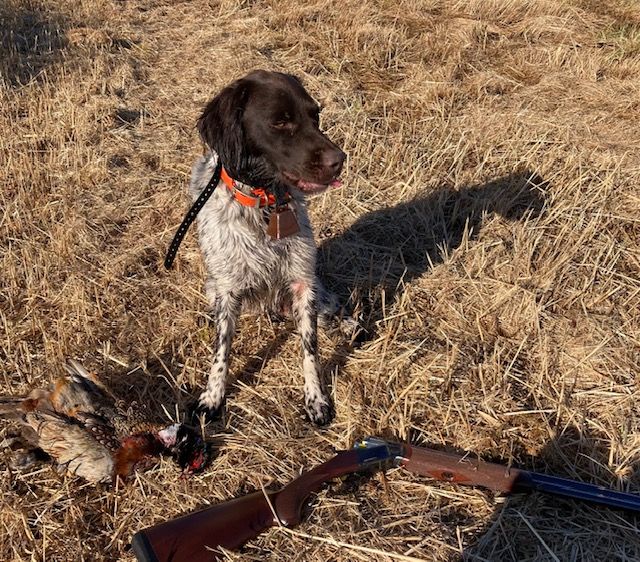 While hunting, Beaker, is a very cooperative dog with lots of drive and determination. Beaker covers ground effortlessly and has a stunning point when he enters the scent cone and locates game. He has hunted various specious such as; pheasants, sharptail, ruffed grouse, woodcock, chukar, ducks, and rabbits. Beaker is “laut” on furred game. This means that he will bark on a rabbit track or when blood tracking a deer. His tracking capabilities and locating of down game is exceptional. Beaker has retrieved all shot game for Chris and has not yet lost any game. This is one of the great qualities that is well known for the Small Munsterlander breed.