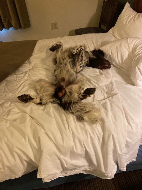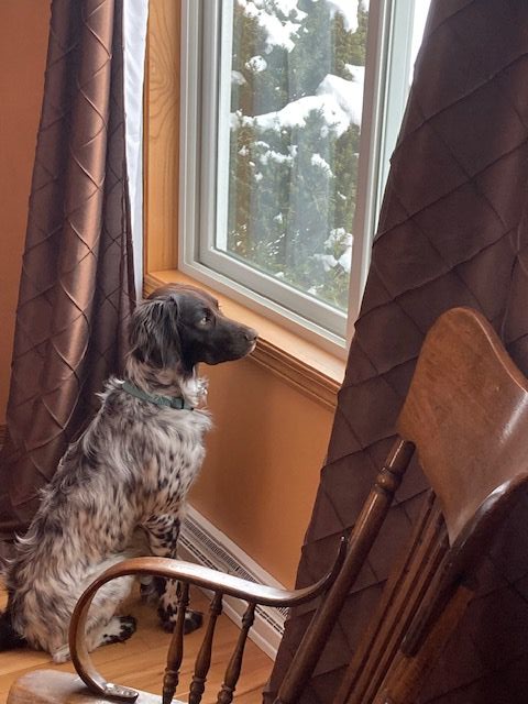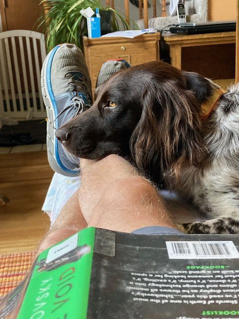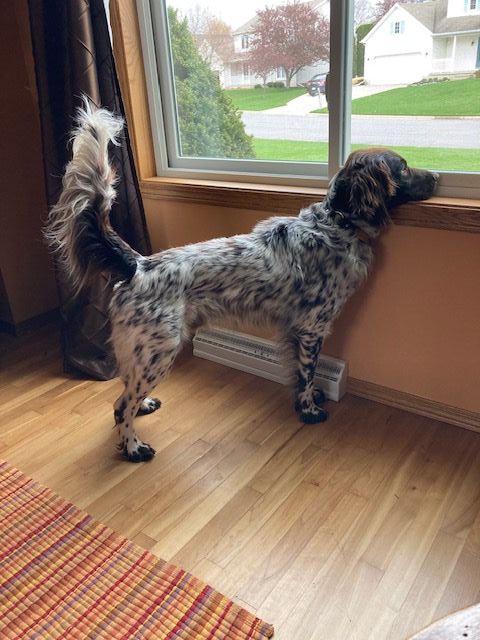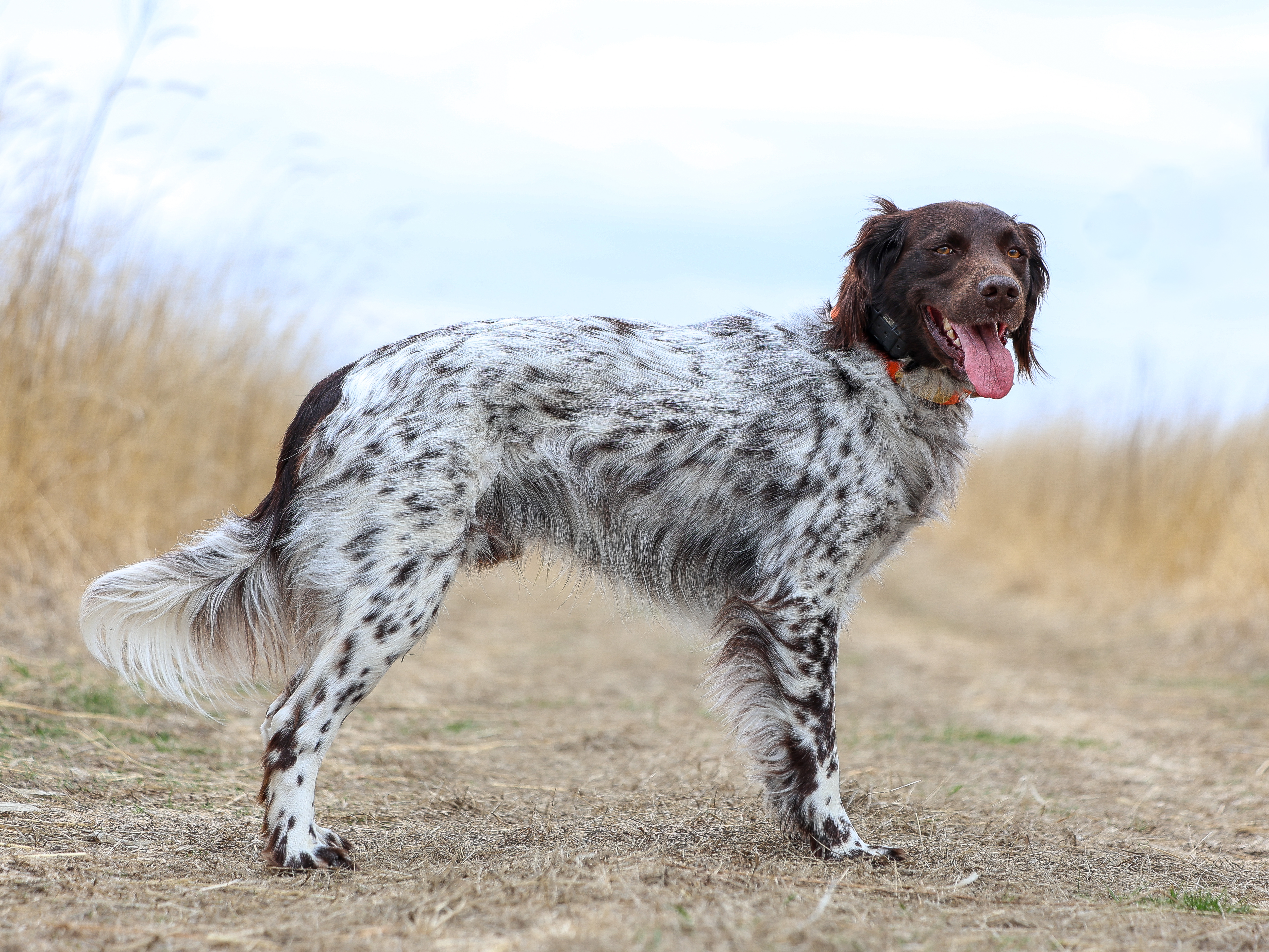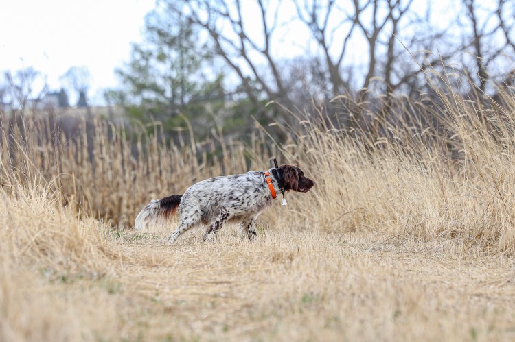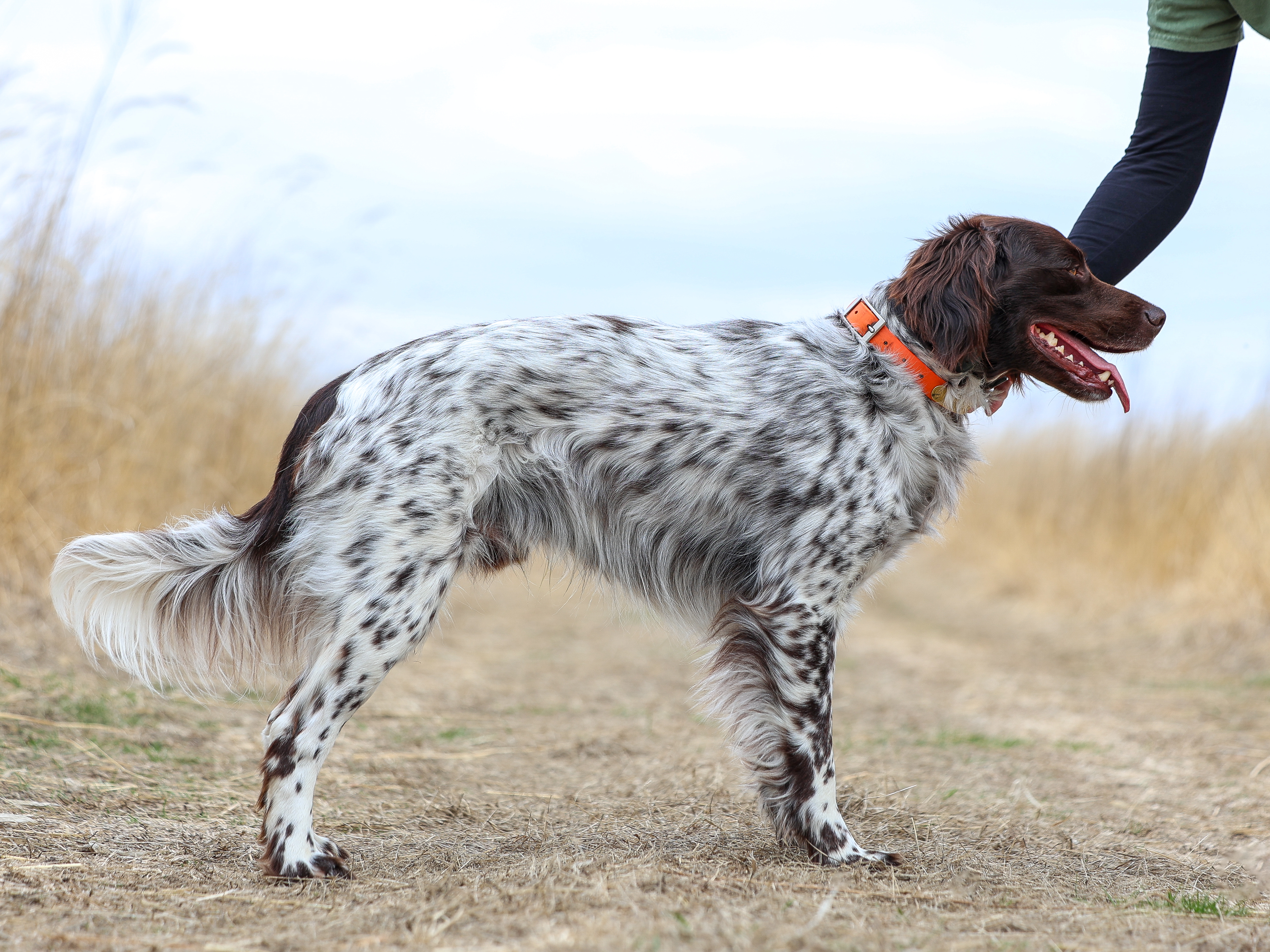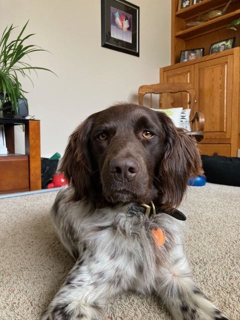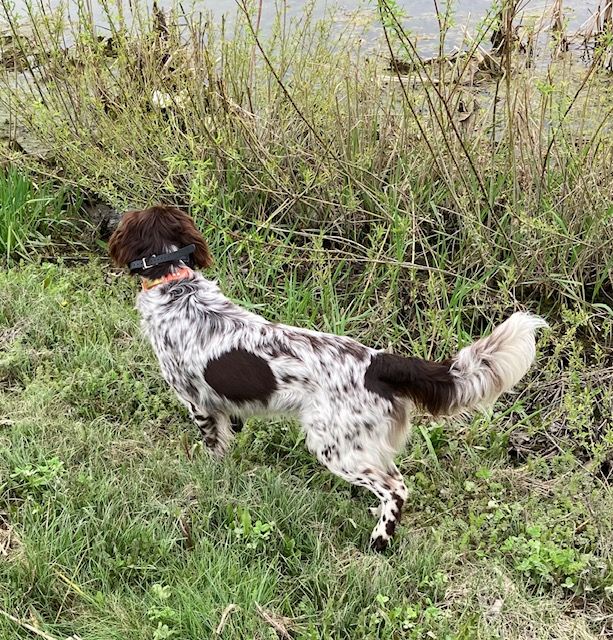 Beaker is from Brush Dale Kennels in Iowa and now lives in Verona, Wisconsin with Chris and Sarah Worley. Beaker is a very attractive male with extensive furnishings and a beautiful flagged tail. He weighs approximately 50lbs and is above average in height for a male Small Munsterlander. In the home Beaker is a spoiled house dog who typically is found on the couch relaxing. The calm nature is due to his, at minimum, 1 hour off leash time every day either training or playing. Beaker likes to follow Chris around the house waiting for his time to go outside and train.