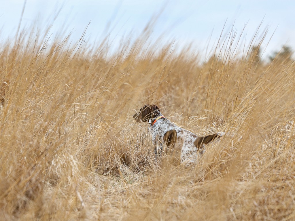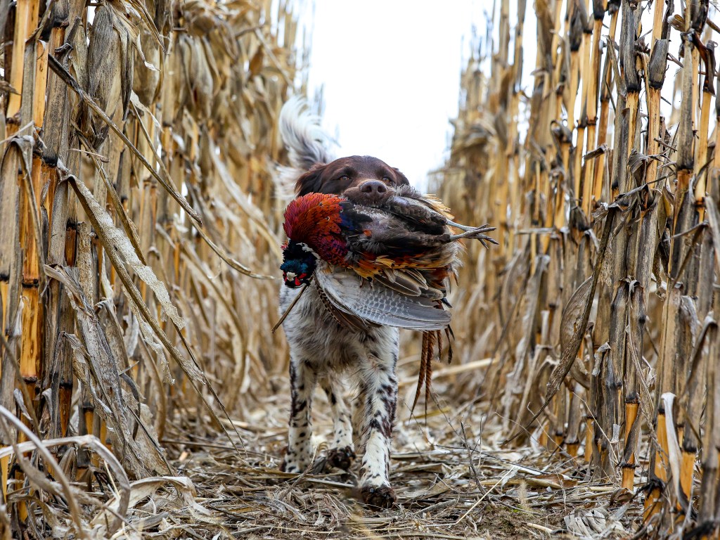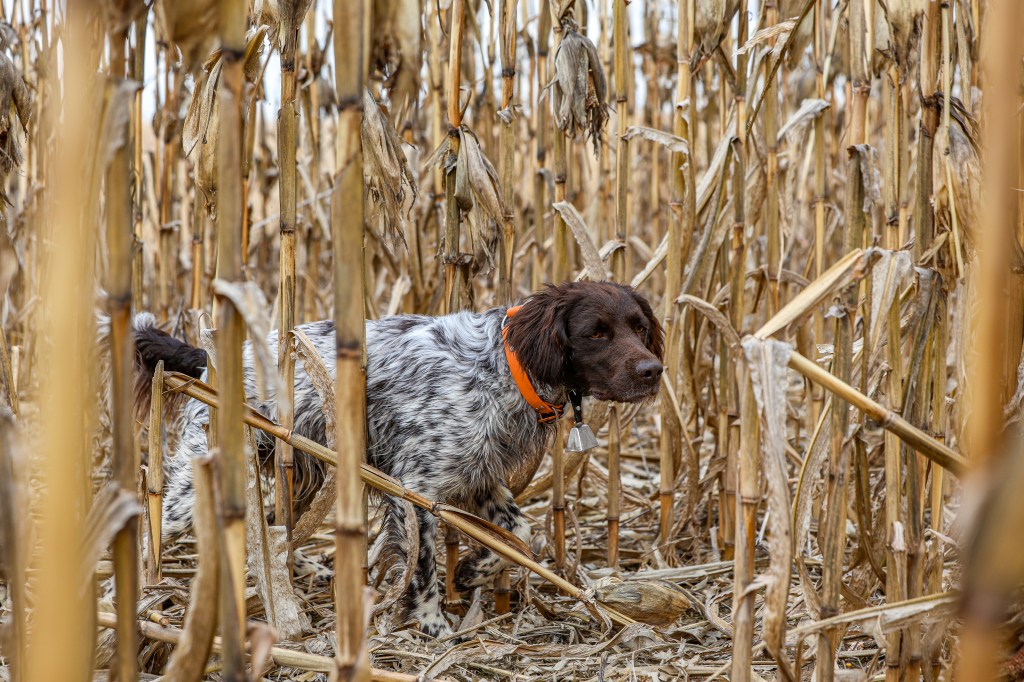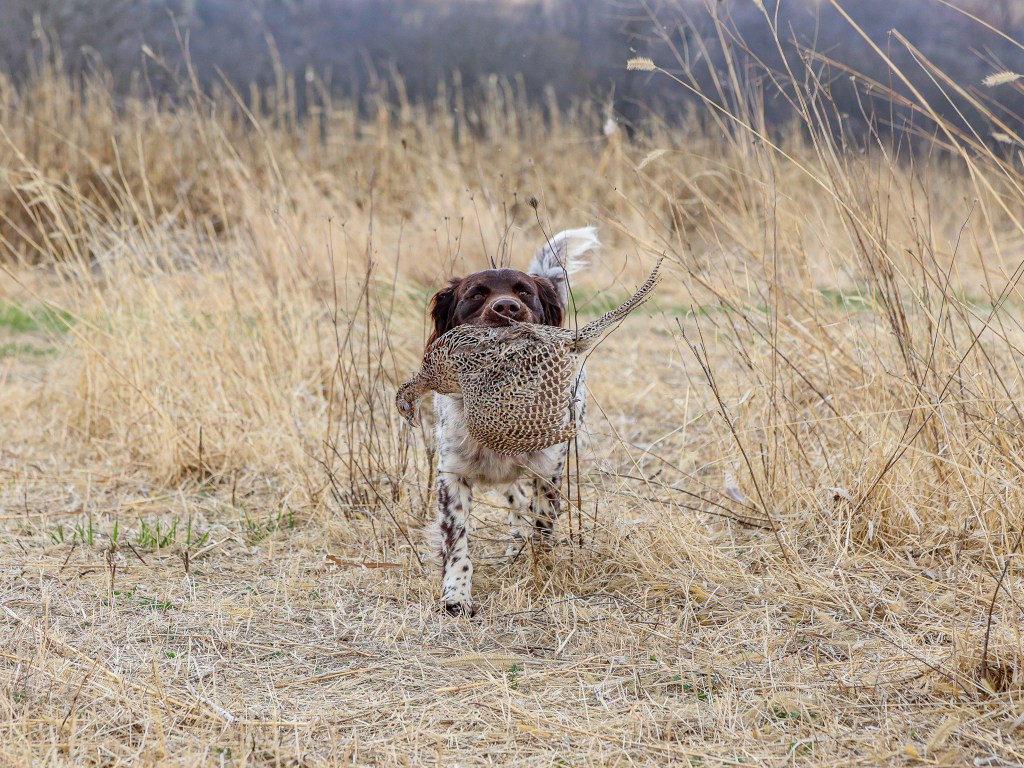 While hunting, Beaker, is a very cooperative dog with lots of drive and determination. Beaker covers ground effortlessly and has a stunning point when he enters the scent cone and locates game. He has hunted various specious such as; pheasants, sharptail, ruffed grouse, woodcock, chukar, ducks, and rabbits. Beaker is “laut” on furred game. This means that he will bark on a rabbit track or when blood tracking a deer. His tracking capabilities and locating of down game is exceptional. Beaker has retrieved all shot game for Chris and has not yet lost any game. This is one of the great qualities that is well known for the Small Munsterlander breed.