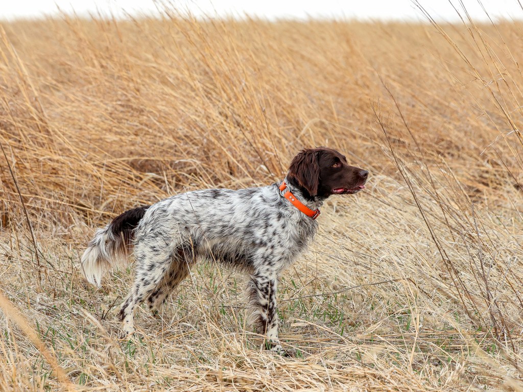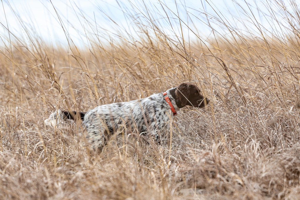 Beaker is from Brush Dale Kennels in Iowa and now lives in Verona, Wisconsin with Chris and Sarah Worley. Beaker is a very attractive male with extensive furnishings and a beautiful flagged tail. He weighs approximately 50lbs and is above average in height for a male Small Munsterlander. In the home Beaker is a spoiled house dog who typically is found on the couch relaxing. The calm nature is due to his, at minimum, 1 hour off leash time every day either training or playing. Beaker likes to follow Chris around the house waiting for his time to go outside and train.