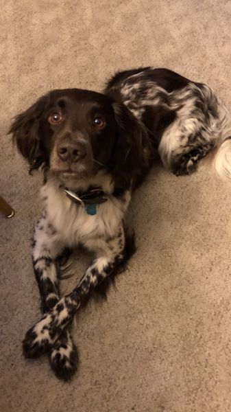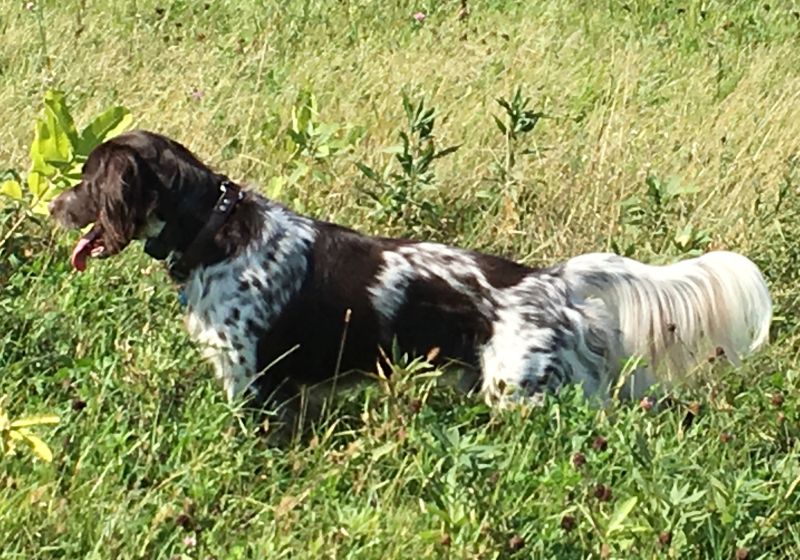 Jager is from Brush Dale Kennels in Iowa and now lives in Cokato, Minnesota with his owner Scott Green. Jager lives with another small munsterlander, Lovec or IntCH Brush Dale’s Cheap Shot. Jager has an attractive, medium dense, soft, roan coat with gorgeous and extensive furnishings. He weighs approximately 48lbs and is average in height for a male Small Munsterlander. In the home Jager is a very calm and affectionate dog who you’ll find right next to his owner. Jager and Scott have an incredible bond. Scott describes Jager as a once in a lifetime kind of dog with his temperament, cooperation, trainability and how great of a hunting dog he is.