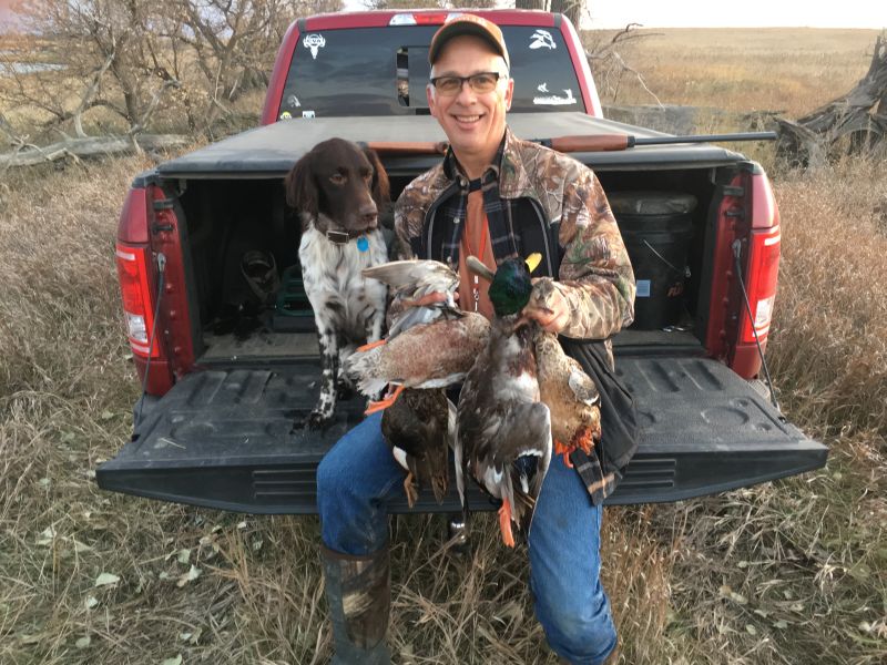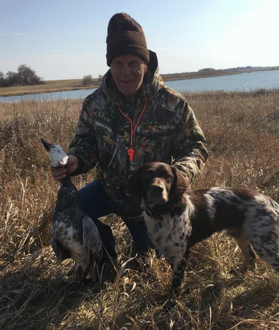 Scott takes Jager hunting for upland and waterfowl birds in Minnesota, North Dakota, South Dakota, Iowa and Kansas. Jager has hunted pheasants, quail, chukar, grouse and various waterfowl species. Ever since a young puppy, Jager has had an incredible prey drive for the breed. Searching for game was very natural for Jager and he excelled at marking and retrieving all shot birds for Scott. When Scott takes Jager hunting he doesn’t have to worry about recovering game, Jager has brought back 100% of birds that Scott has shot with him. Without formal training, Jager’s first waterfowl hunting experience was when he was 11 months old. Scott shot a massive Canadian goose that he sent Jager out for the retrieve. Jager circled the goose a few times trying to figure out how to retrieve it. He finally realized he could grab the neck and then retrieved it back to shore about 30 yards.