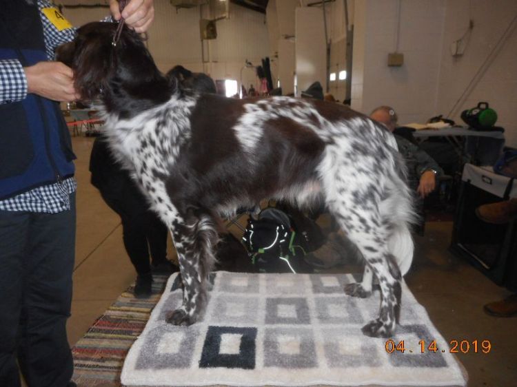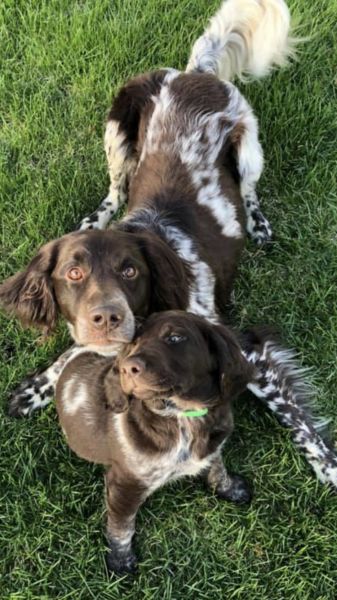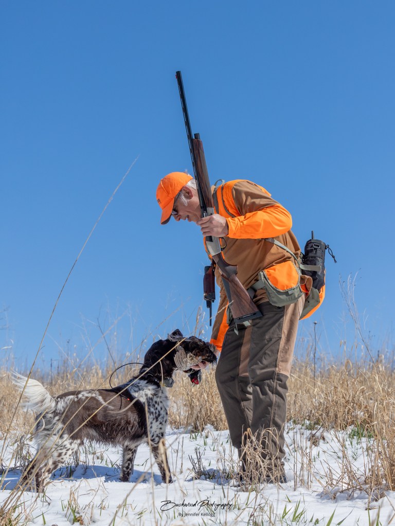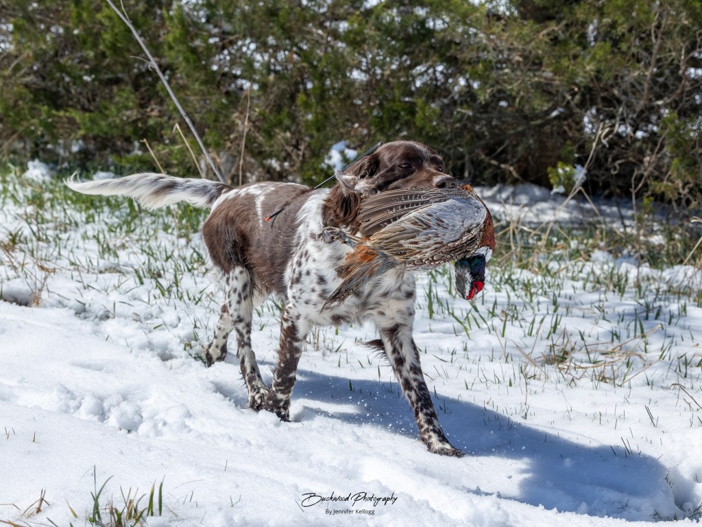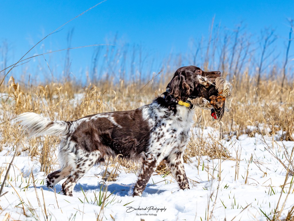 Jager is well know in the small munsterlander world for earning a Versatile Champion Title through the NAVHDA testing system in 2022. Becoming a Versatile Champion is a huge accomplishment showing a dog’s hunting capabilities and their trainability. Jager has done exceptionally well testing in NAVHDA with a maximum score on his Natural Ability test at 10 months old and a Prize 1 Utility Test at only 3 years old. One time during a training session, Jager, surprised Scott with how smart he is. Scott lined him up for a duck search and sent him across a pond to retrieve a duck. Scott saw Jager get the duck and then he disappeared for a few minutes. Scott was worried that he was messing around with the duck until here comes Jager with two ducks in his mouth heading back across the pond to Scott. There was no need to do a resend since Jager already got the other duck from the complete opposite direction and was bringing it back.